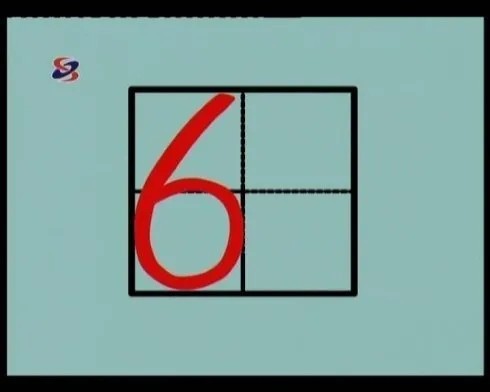 “6”像哨子。从上线偏右一点起向下方画一个孤形,碰左线、底线,向上碰右线画成一个小圆,小圆上面超过中线。