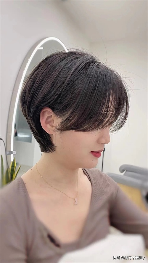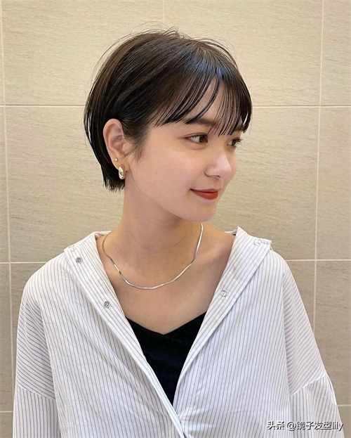 短发前面刘海也是要根据自己的脸型,来选择搭配不同的长度,额头比较宽的话,可以适当的放长一些,梳成这种微分的八字刘海,能有效地遮挡过宽的额头,瘦脸自然美美哒。