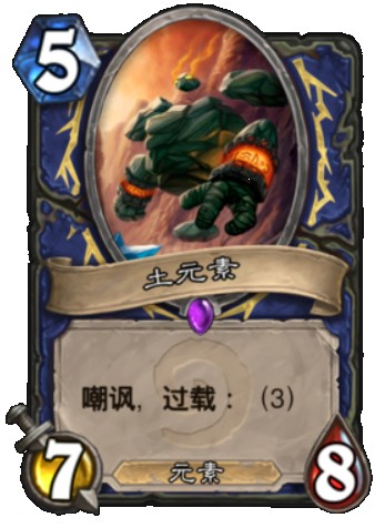 虽然石母没有做成卡牌但的仆从身材却异常强劲。5费7-8的身材外加嘲讽,堪称逆天。3点过载有些棘手尤其是当他入场之后就被解掉之后。7点攻击力很尴尬,使其进入了王牌猎人的射程,面对法师和萨满时你要谨慎对其使用先祖之魂,因为一旦被变形你将血本无归。一旦存活下来,土元素将会是对手无法直视的梦魇。