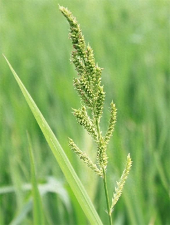 叶鞘松弛,下部者长 于节间,上部者短于节间;无叶舌;叶片无毛。圆锥花序主轴具角棱,粗糙;小穗密集于穗轴的一侧,具极短柄或近无柄;第一颖三角形,基部包卷小穗,长为小穗的1/3-1/2,具5脉,被短硬毛或硬刺疣毛,第二颖先端具小尖头,具5脉,脉上具刺状硬毛,脉间被短硬毛;第一外稃草质,上部具7脉,先端延伸成1粗壮芒,内稃与外稃等长。形状似稻但叶片毛涩,颜色较浅。稗子与稻子共同吸收稻田里养份,因此稗子属于恶性杂草。