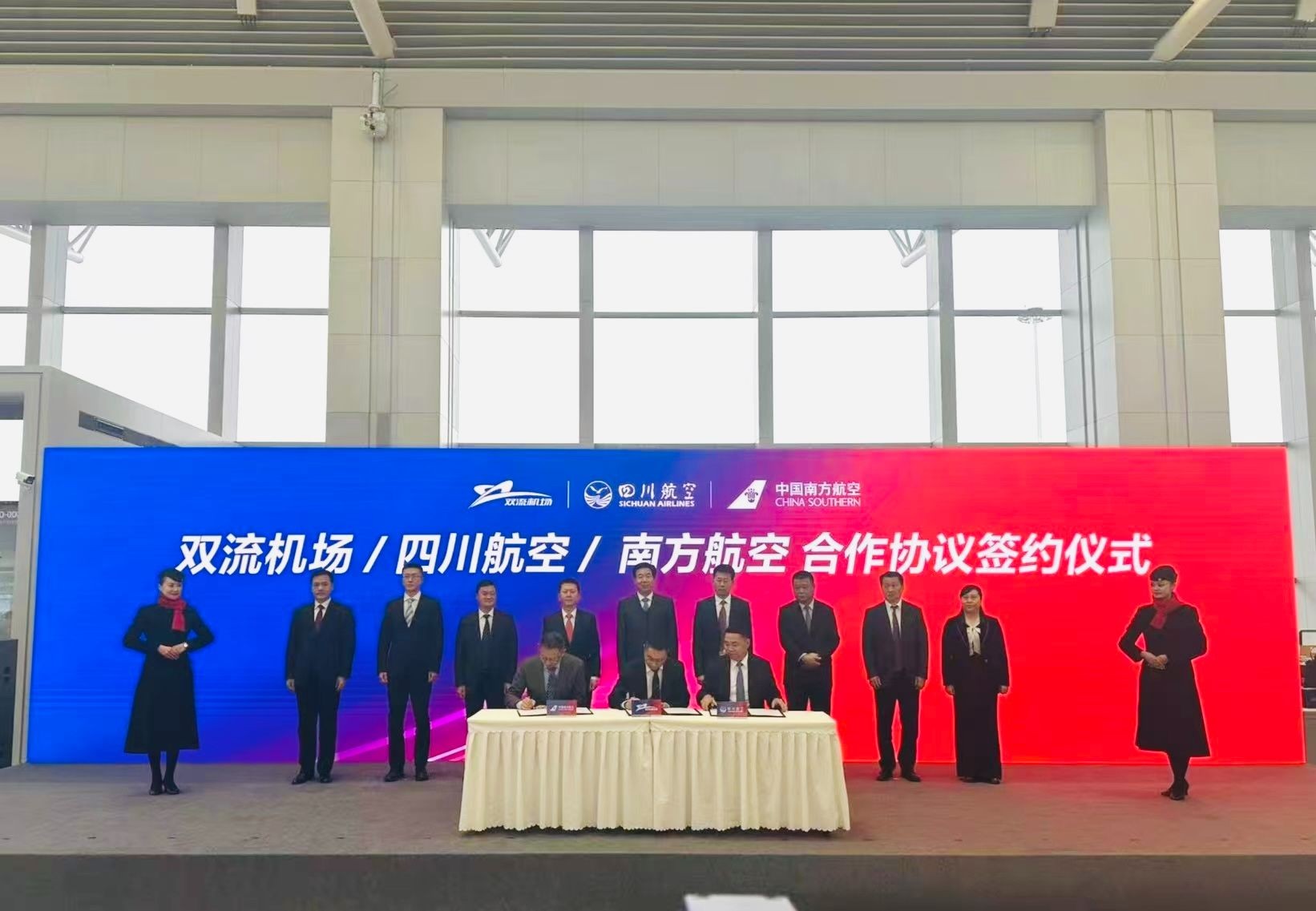 2月24日,成都双流国际机场1号航站楼恢复运行。当日,四川航空在双流机场1号航站楼举办转场启动仪式,与双流机场、南方航空签署合作协议,三方将在未来携手共进,为旅客提供更加优质的服务。