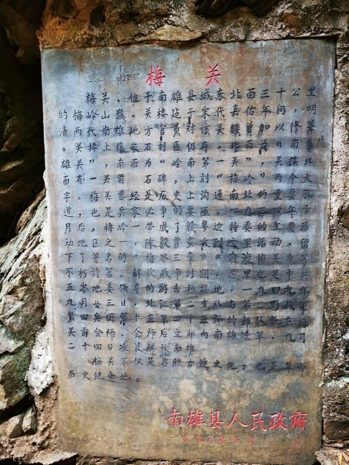 梅关古道被两峰夹峙,虎踞梅岭,如同一道城门将广东、江西隔开。南雄梅关历来是南北交通要通,也是历代兵家必争之地。史称南雄“居五岭之首,为江、广之冲”、“南北咽喉,京华屏障”。南雄的县名也与梅关有关,南雄乃南粤雄关,而雄关指的就是梅关。