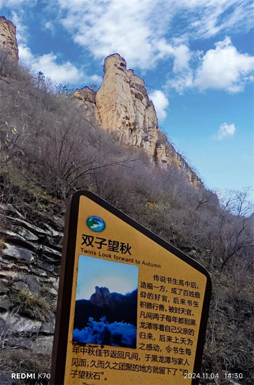 从头潭前行抬头仰望,一座奇葩石峰映入眼帘,它便是“双子望秋石”,这里留下了一段动人的民间好官被天庭招为天官的传说故事。