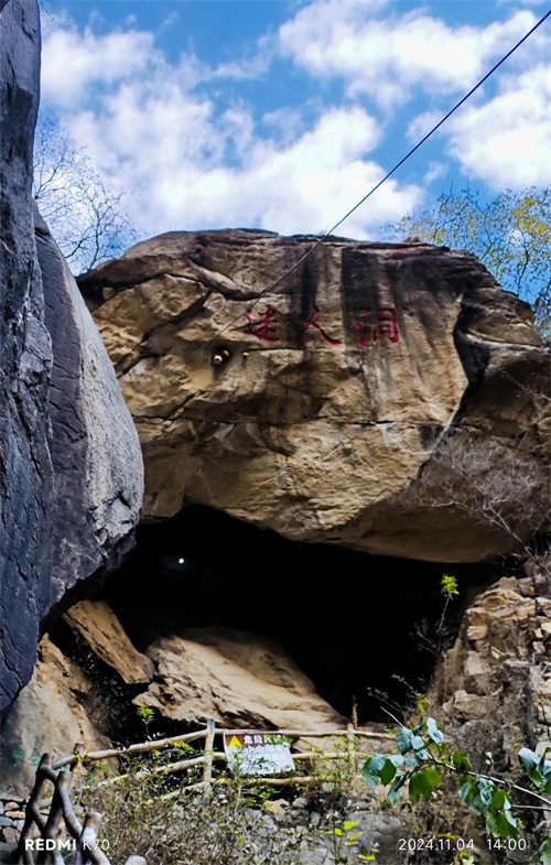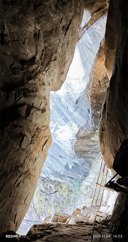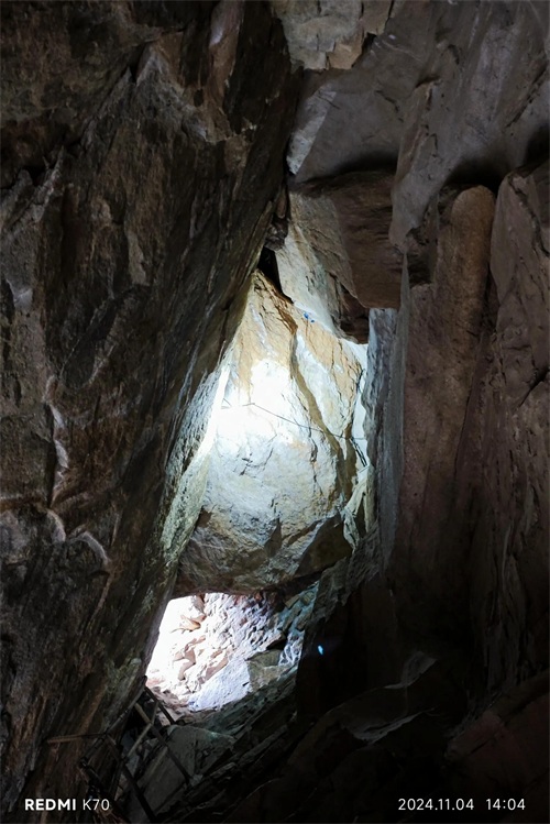 从落雁潭攀上38级台阶,便是通天洞,又称迷人洞。15米长的狭窄石洞只能容一人低头通过。