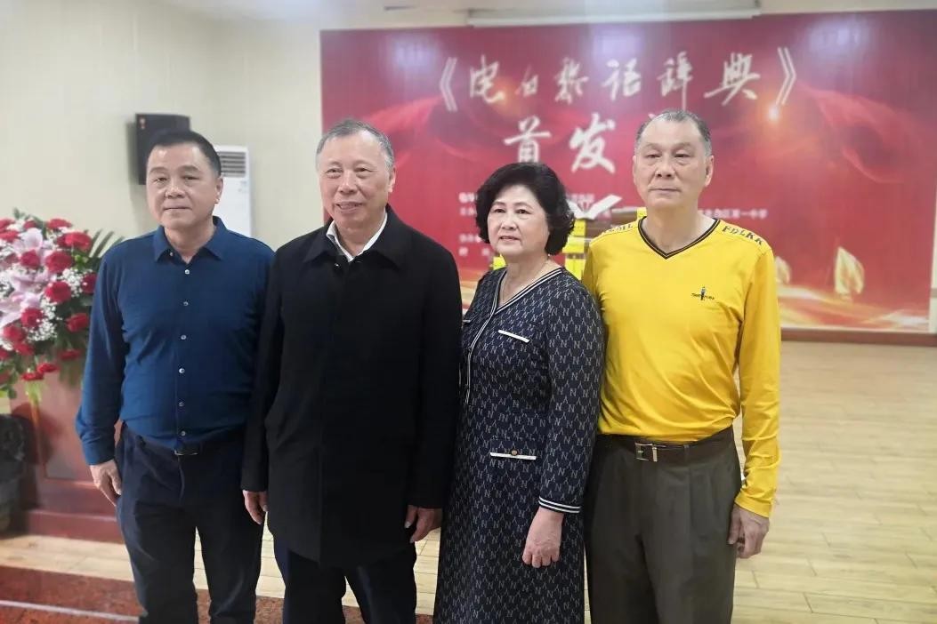 《电白黎语辞典》接力编撰者李创国副教授与谭文炘老师仨儿女(左一谭论 右谭弘 大女谭明)在首发式现场