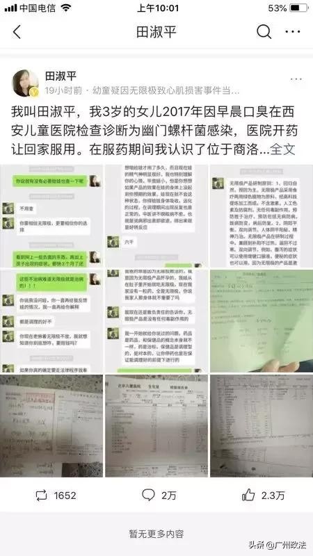 事件引起广泛关注,无限极17日下午回复称,前期对田淑平女儿的健康问题关怀不够,深表歉意并诚恳道歉。正在申请陕西省卫健委对田淑平女儿的身体健康进行全面检查。