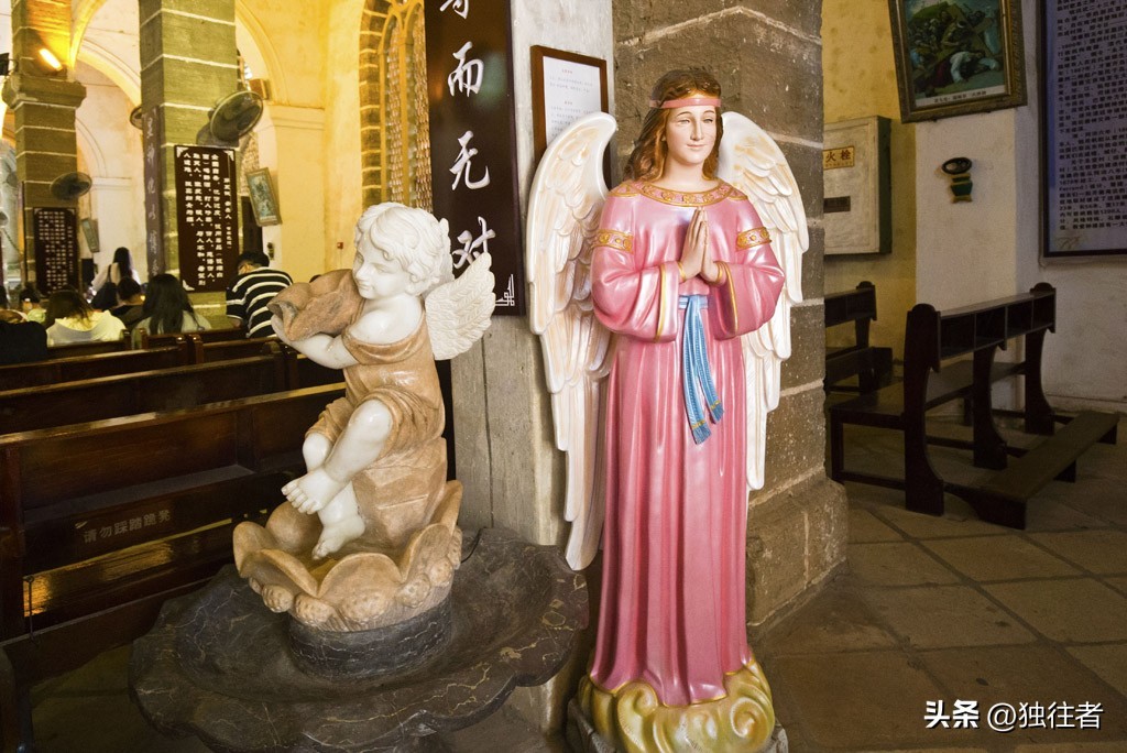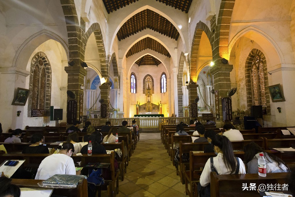 经过百年洗礼,教堂仍然保留了最古朴原始的风貌。站在教堂前,历史的厚重感扑面而来,它见证了岛上居民和时代变迁。如今,古老斑驳的墙体、哥特式的建筑风格、特有珊瑚石建筑和天主教文化这些元素交织在一起,天主教堂已成为旅游胜地,网红打卡地,摄影爱好者的圣地。我们到教堂时,正赶上一大批艺术学校的学生在这里临摹写生。