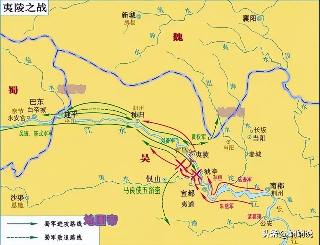 刘备退居马鞍山自卫,又被四面围攻,至此,蜀军溃不成军。此战之后,刘备一方几乎全军覆没,败走白帝城,次年四月,大病亡故。