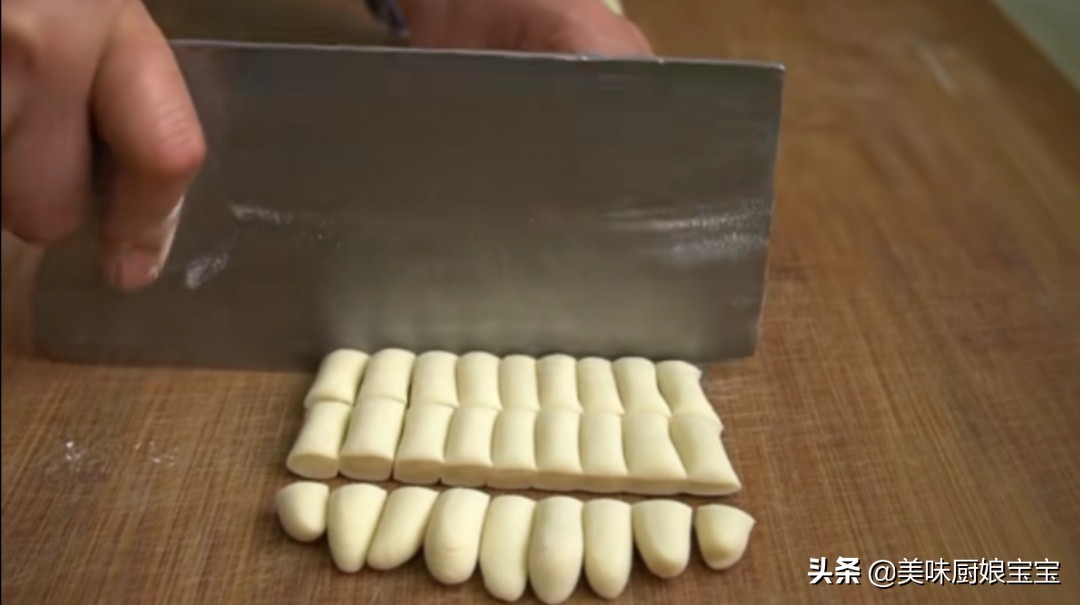 6.把搓好的长条切成长约两厘米的小段,像图中一样,切好以后上面撒点干面粉,防止粘连。