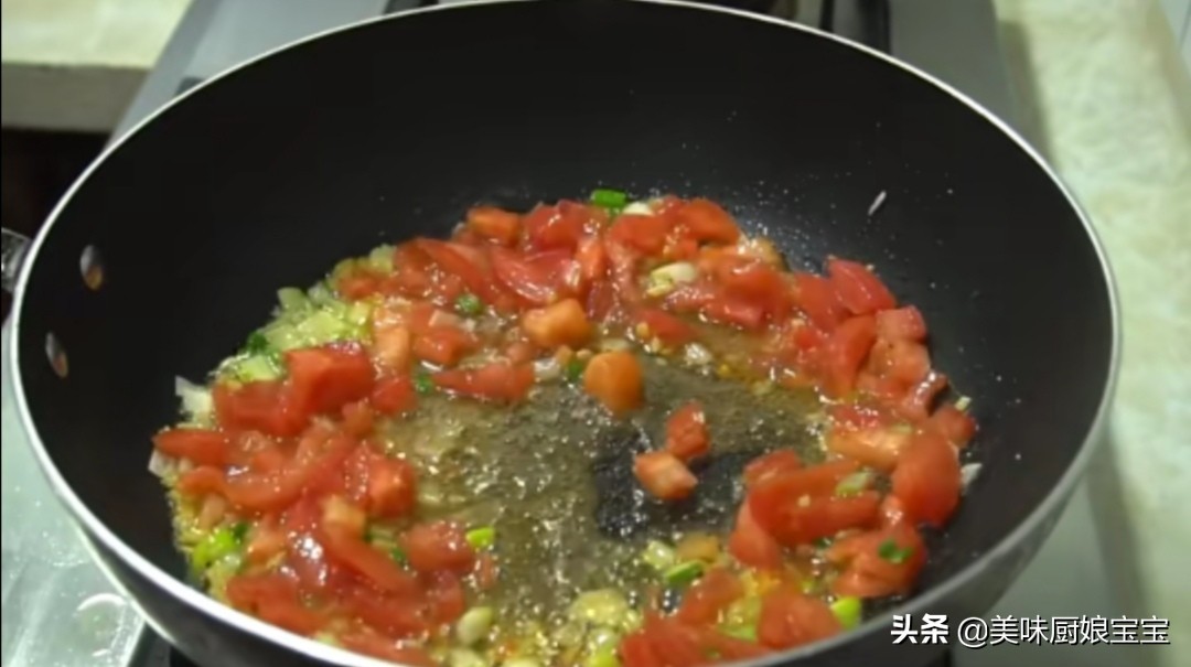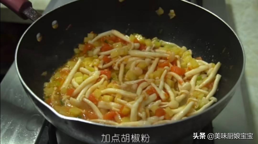 9.热锅放油,油热下入葱花和姜末炒出香味,然后放入切好的西红柿炒出汤汁,然后加入一小勺盐调味,然后下入准备好的土豆丁翻炒两分钟左右,然后再加入提前焯过水的白玉菇翻炒片刻,加入一点胡椒粉和一勺生抽翻拌均匀,然后加入适量的清水,用大火烧开。