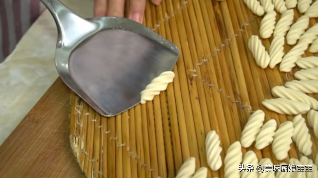 (也可以准备几根筷子,然后把面段放到筷子上,用水果刀背面一边压一边滑过去,也可以出来一个好看的形状。还可以直接用大拇指一边压,一边往前撵,撵成一个像卷一样的形状即可,这个方法是最简单的,但是做的多了,大拇指第二天会疼。)