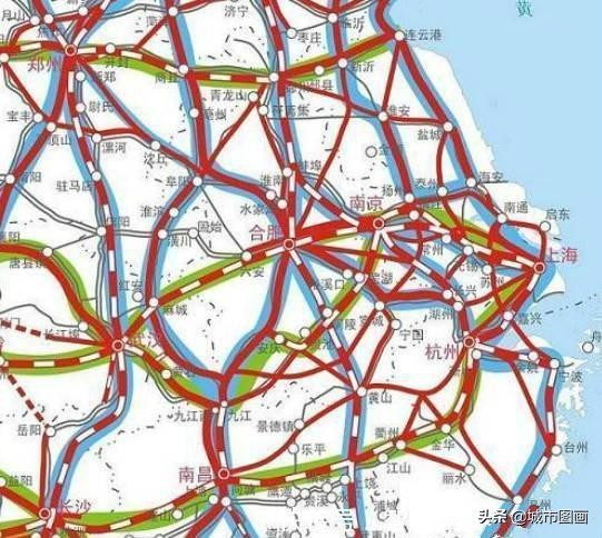 华东的 合肥,是高铁新贵,多路。南京由于位置的尴尬,不东不中,地位相对走弱了。在未来城市格局中,同属长三角城市群的合肥、南京的恶战不可避免。从下图也可以看出,长三角高铁密如蛛网。