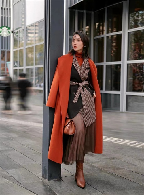 橘色系的长款大衣比较适合身高比较高的女生来驾驭,纯色系的橘色大衣是比较经典的款式和风格。想要增加单品的层次感,可以选择同色系的打底上衣,和橘色系的大衣形成一个很好的呼应衬托效果。