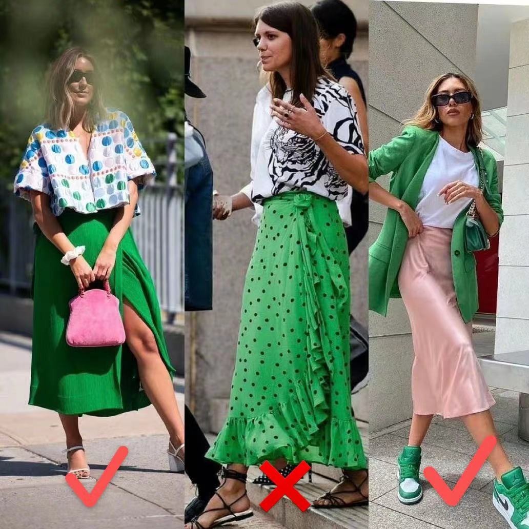 大面积穿绿色,会使搭配风格鲜明,让人印象深刻。但不推荐大家选择整身都是非常花哨的元素图案,如果有一件单品选择不当就会破坏整体的搭配效果,得不偿失。