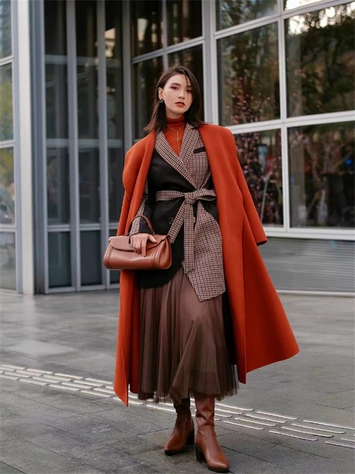 橘色系和咖色系搭配起来有着秋冬巧克力的氛围感,咖啡色和米白色结合的西装外套和橘色系大衣叠穿的手法很是抢眼,下装的部分选择同色系的咖色裙子,显得整个人干练的同时非常温柔,搭配的公式为:橘色系打底+咖色米白色拼接外套+橘色系大衣,也被称为三明治穿法。
