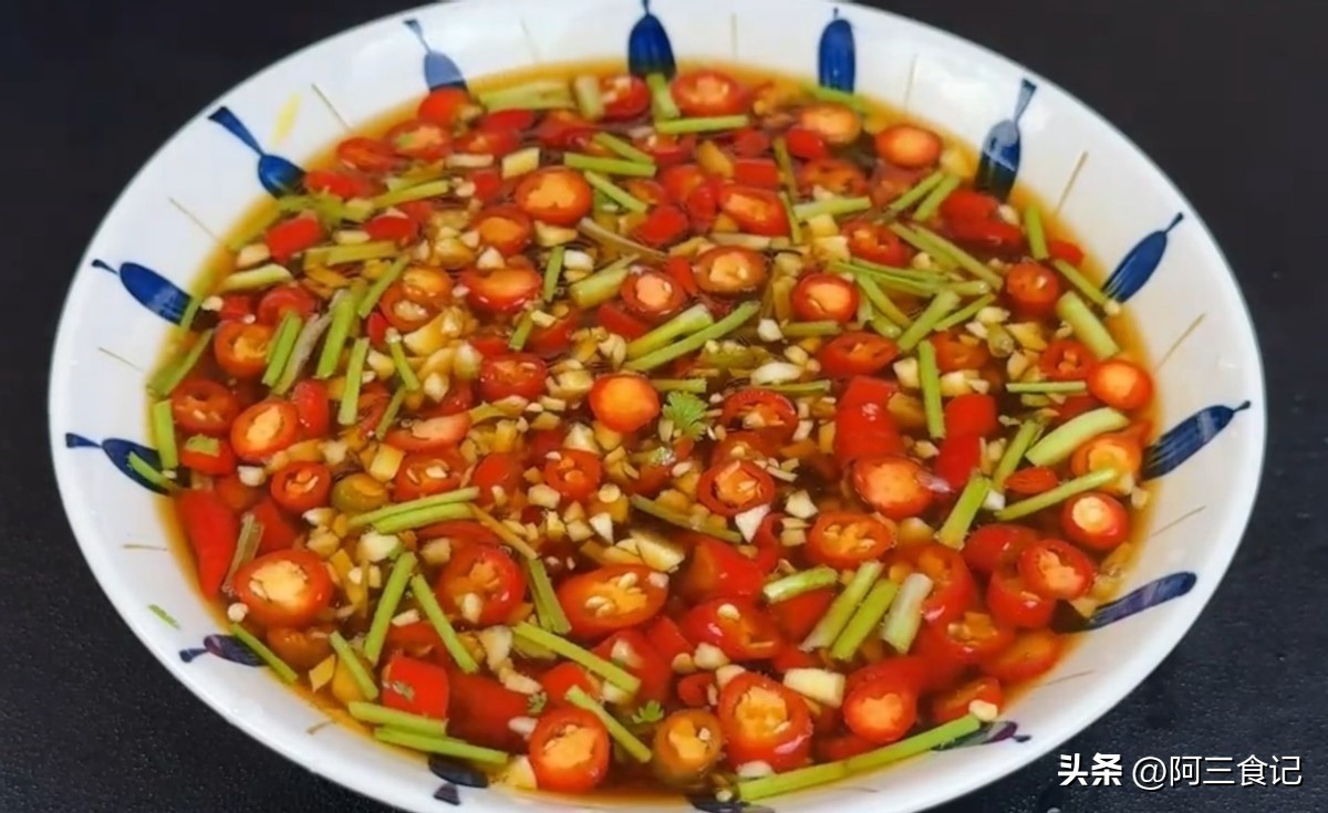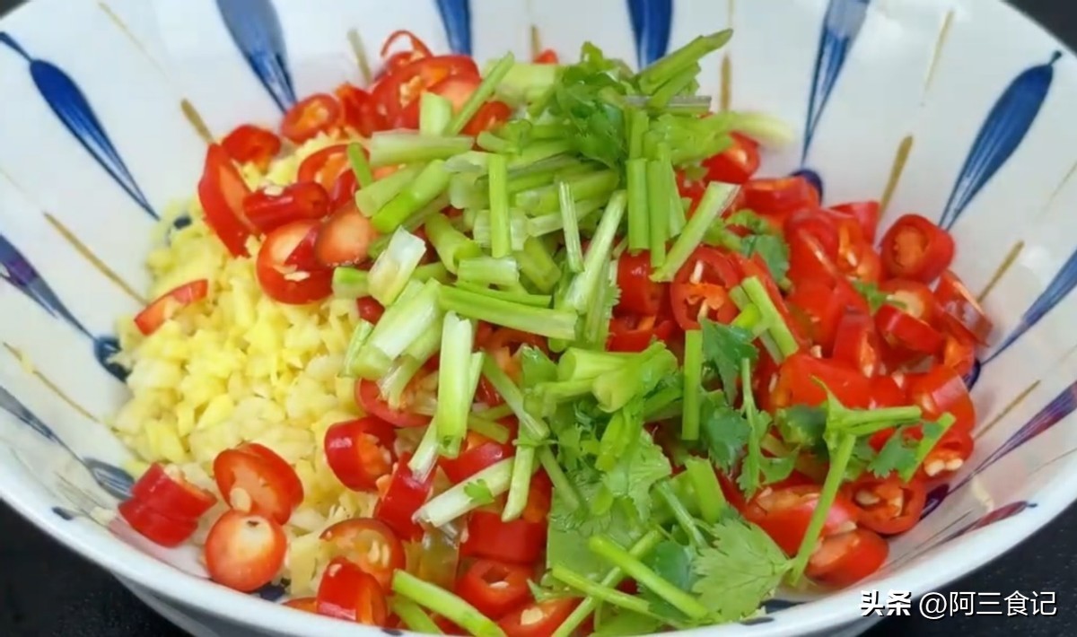 第七步,准备料汁。现在把蒜末,姜末,辣椒圈和香菜放在一起,再给里面加入适量的食盐、白糖,还要放一些芥末提味,柠檬也挤进去几滴就够了,接着给碗里面倒入半碗的蒸鱼豉油,再加入半碗的清水搅拌均匀之后,料汁就准备好了。