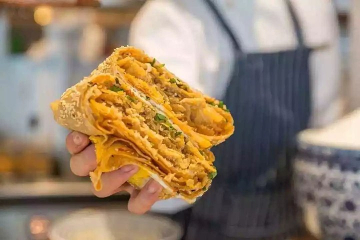 煎饼果子可以作为早餐,也可以作为宵夜来卖。甚至有的人不吃晚饭,吃个煎饼果子就饱了。是什么原因让煎饼果子如此受欢迎呢?原来是煎饼果子可以自由搭配,你可以选择加培根、火腿、鸡蛋,甚至是鱿鱼,也可以选择自己喜欢的酱料,相当于DIY自己的食物。而且,煎饼果子表皮酥脆,食材多,一口咬下去,口感非常丰富,吃起来非常爽。