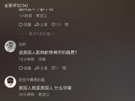 黑龙江的网友问是否美国人影响了稿费;河南的网友认为美国人就是美国人,不应使用华裔这个词。