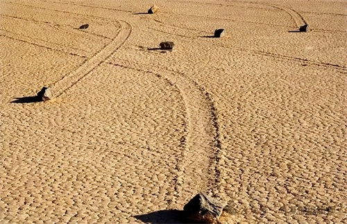 在美国加州的死谷,几百磅重的石头竟然可以在湖床上滑行,这一现象困扰了科学家很多年。最近,有这样一种假说似乎是合理的,即雨后的狂风可以使笨重的岩石在光滑的湖床上滑行。