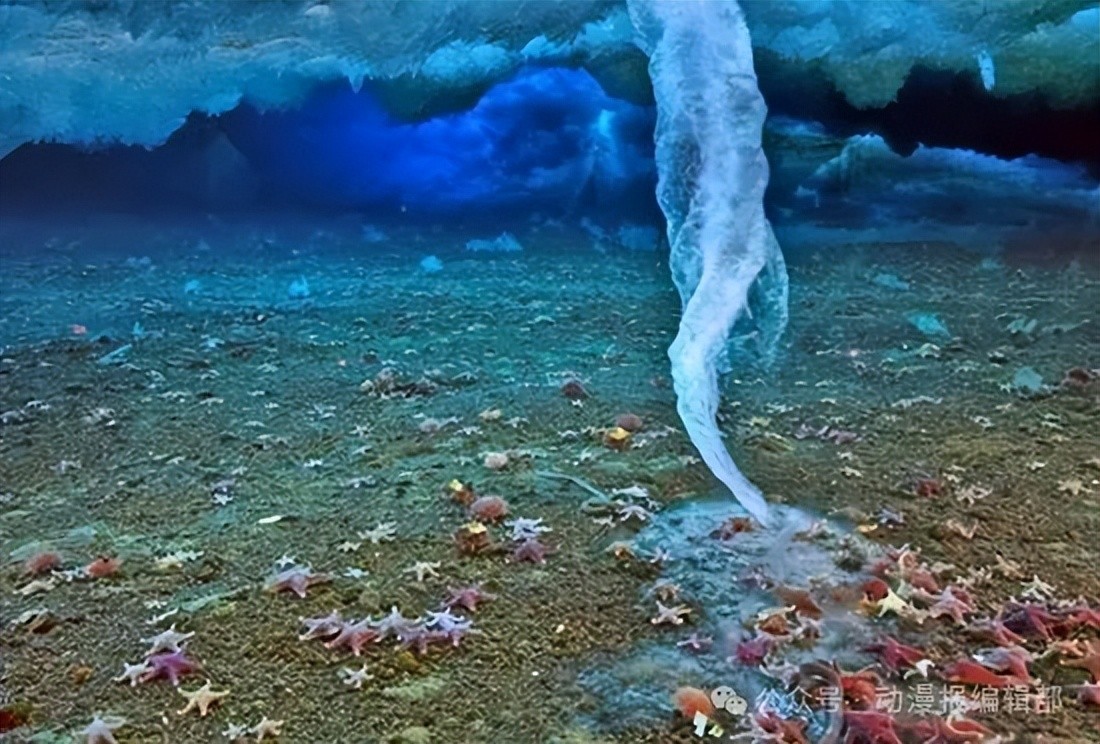 死亡冰柱在上世纪60年代初次被人发现,它是在地球南北极海域发生的一种自然现象。其形成原理是从海面延伸下来的冰柱释放出低温、高浓度的盐水。随着盐水向下沉落,周遭的液态水逐渐凝结成绵状冰。最后“死亡冰柱”延伸至海床,瞬间冷冻海星和海胆等生物。