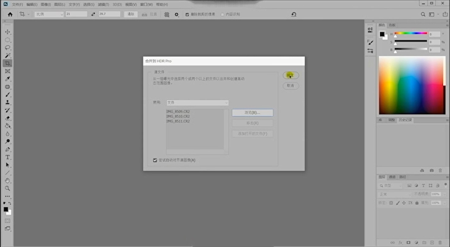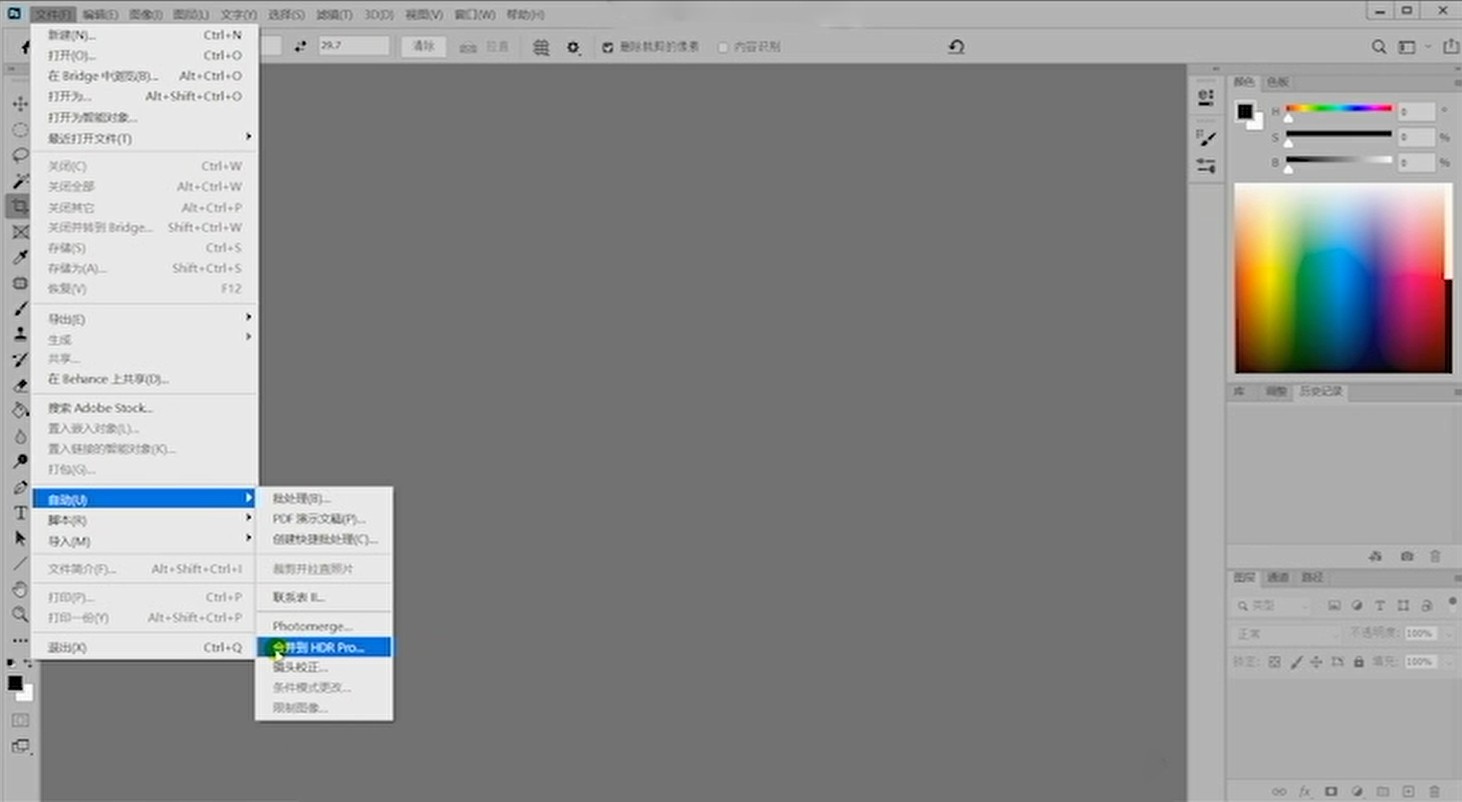 打开PS,在文件菜单里点击自动选项里面的合并到HDR Pro