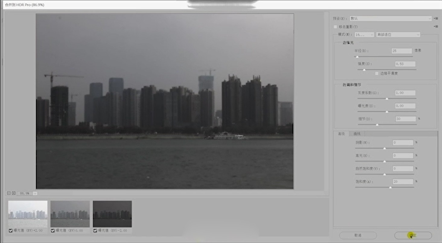 三张照片就开始自动合并了,在随后弹出的调整菜单,可以根据自己的需要来调整旁边的参数。调整完成后点击确定,