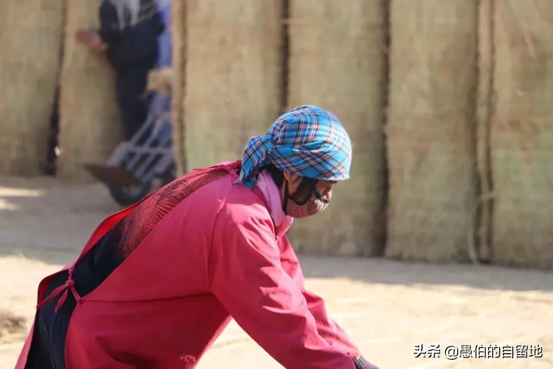 这位编织草苫子的大嫂,全副武装,犹如武打片里的女侠一般。