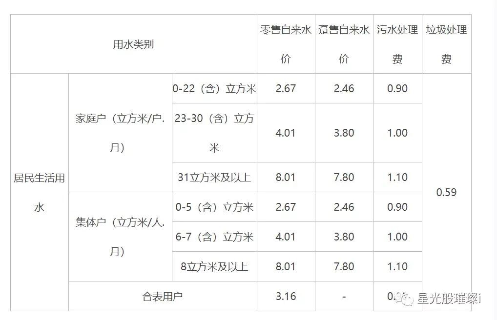 31立方米及以上零售自来水价为8.01元/立方米,趸售自来水价为7.80元/立方米,污水处理费为1.10元/立方米,垃圾处理费为0.59元/立方米。