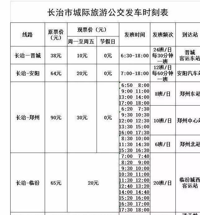 今年5月6日,由66元调整至51元发车地点为长治市客运西站目前于我市开通城际公交只有晋城、安阳、郑州、临汾4条线路