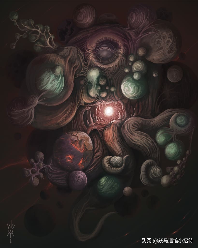我们可以把祂看作宇宙大爆炸之前的奇点,只不过在克苏鲁神话中,祂被描述成一个古神,是一切的开端和起源。或许是作为一种至高的存在,祂的行为毫无逻辑和意义,别人完全无法理解,阿撒托斯又被称作“盲目和愚钝之神“(The Blind Idiot God)。
