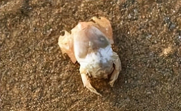 12月27日,山东青岛。潘女士及家人在海边沙滩上发现了一只像虾又像蟹的小家伙,表示不认识这是个什么物种。