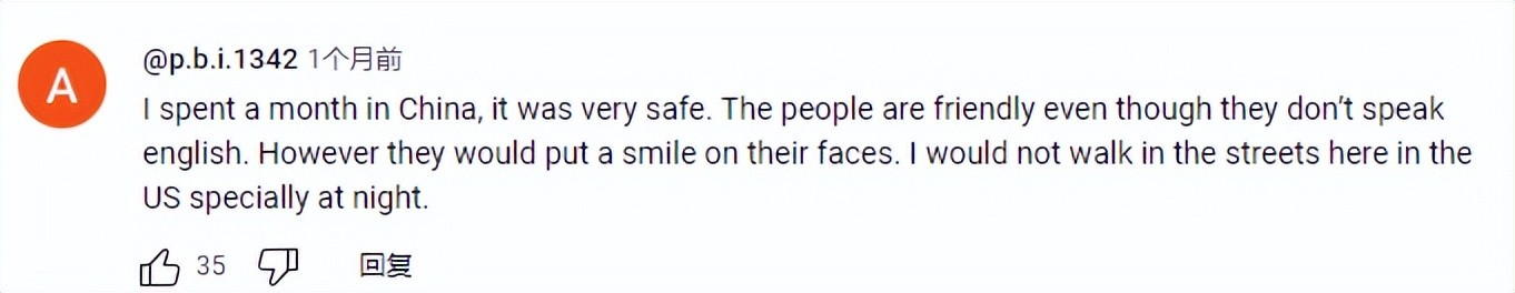 “我在中国呆了一个月,非常安全。 人们很友好,即使他们不会说英语。 不过,他们的脸上都会挂着微笑。 我不会在美国的街道上行走,特别是在晚上。”