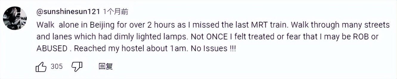 “一个人在北京走了两个多小时,错过了末班车。 走过许多路灯昏暗的大街小巷。 我从来没有感到受到对待或担心自己可能被抢劫或虐待。 凌晨1点左右到达我的宿舍。 没有问题 !!!”