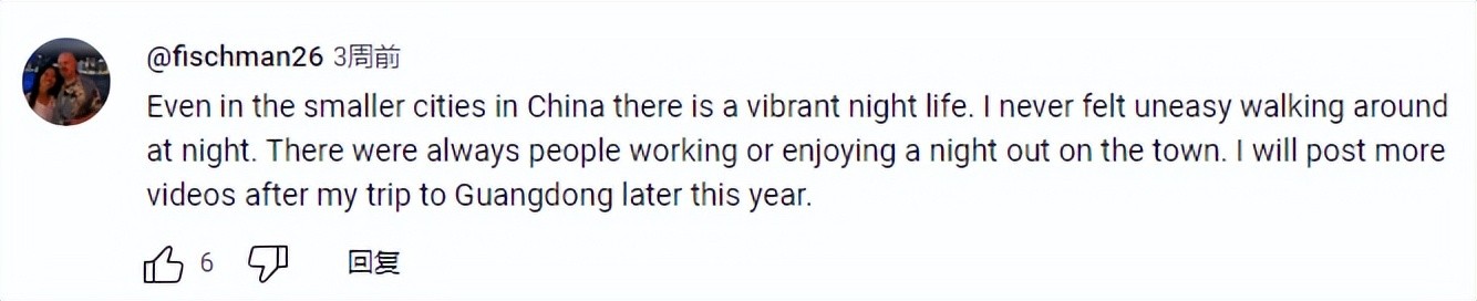“即使在中国的小城市,夜生活也充满活力。 晚上走来走去我从来没有感到不安。 总是有人在城里工作或享受夜晚。 今年晚些时候我去广东旅行后我会发布更多视频。”
