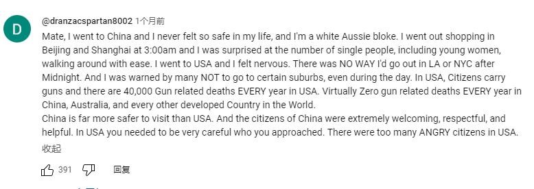 “兄弟,我去了中国,我一生中从未感到如此安全,而且我是一个澳大利亚白人。 凌晨3:00,我在北京和上海出去购物,令我惊讶的是,有很多单身人士,包括年轻女性,都在轻松地走来走去。 我去了美国,我感到紧张。 午夜过后我不可能去洛杉矶或纽约出去。 许多人警告我不要去某些郊区,即使是在白天。 在美国,公民携带枪支,每年有 40,000 人因枪支死亡。 在中国、澳大利亚和世界上所有其他发达国家,枪支相关死亡人数每年几乎为零。