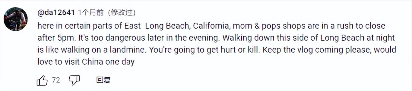 “在加利福尼亚州东长滩的某些地区,夫妻店在下午 5 点后就急于关门。 晚上太危险了。 晚上沿着长滩这一侧行走就像走在地雷上一样。 你会受伤或被杀。 请继续更新视频博客,很想有一天能访问中国。”