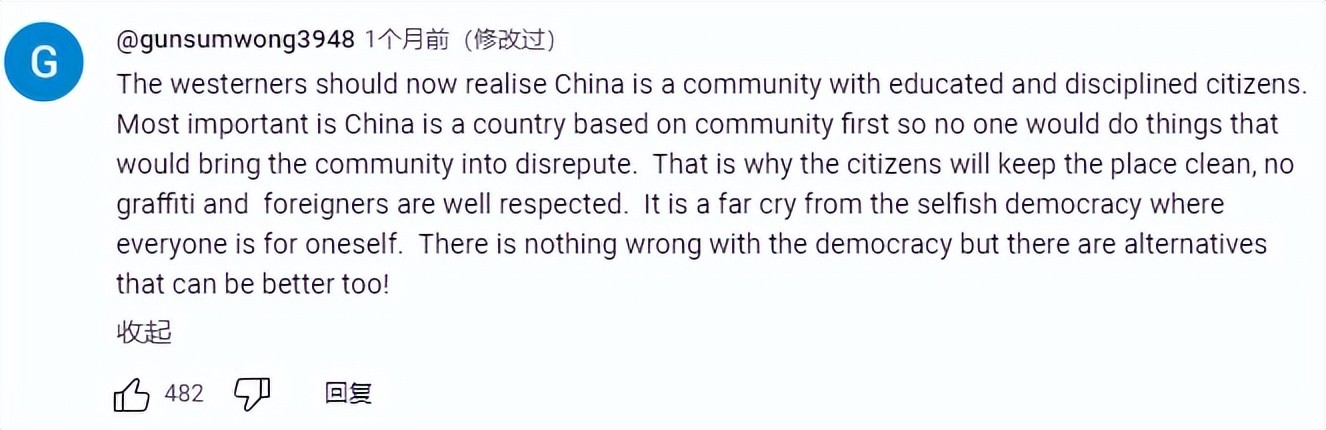 “西方人现在应该认识到,中国是一个拥有受过教育、遵守纪律的公民的社会。 最重要的是,中国是一个以社区为先的国家,任何人都不会做有损社区声誉的事情。 这就是为什么公民会保持这个地方干净,没有涂鸦,外国人也受到尊重。 这与每个人都为自己着想的自私民主相去甚远。 民主没有任何问题,但也有更好的选择!”