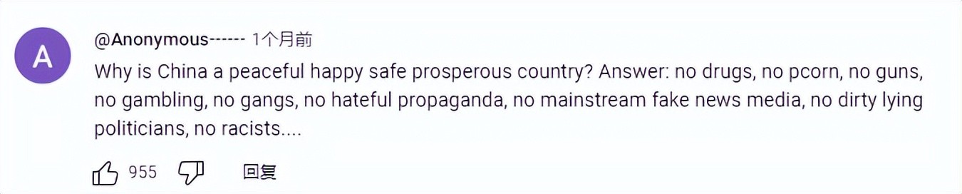 “为什么中国是一个和平幸福安全繁荣的国家? 答案:没有毒品,没有枪支,没有赌博,没有帮派,没有仇恨宣传,没有主流假新闻媒体,没有肮脏的谎言政客,没有种族主义者......”