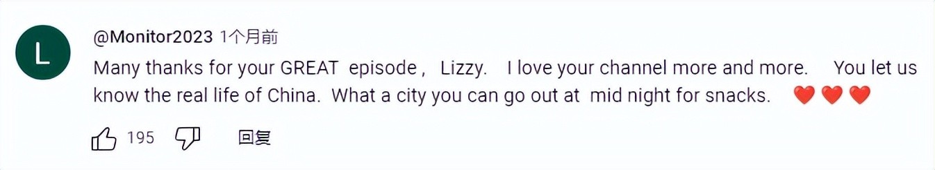 “非常感谢你精彩的一集,莉兹。 我越来越喜欢你的频道。 你让我们了解了中国的真实生活。 这是一个多么适合半夜出去吃零食的城市啊。”