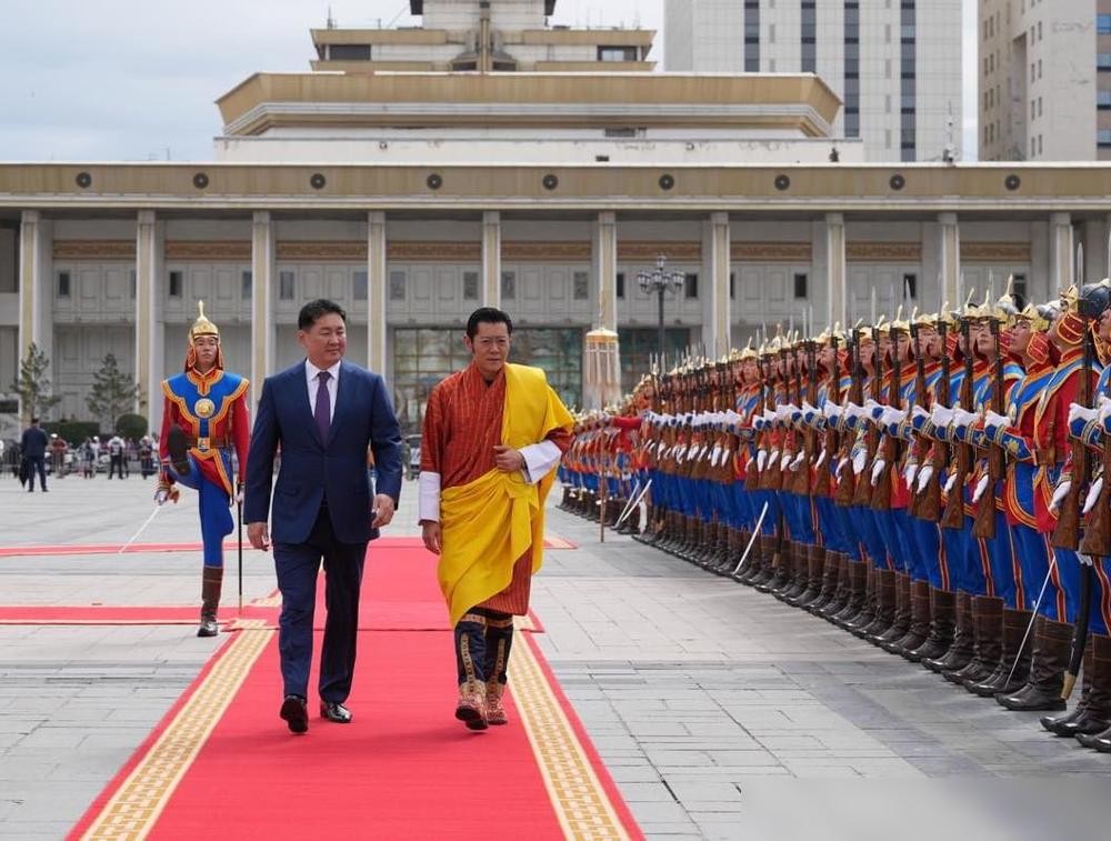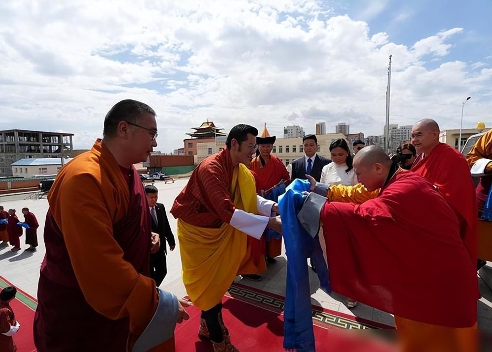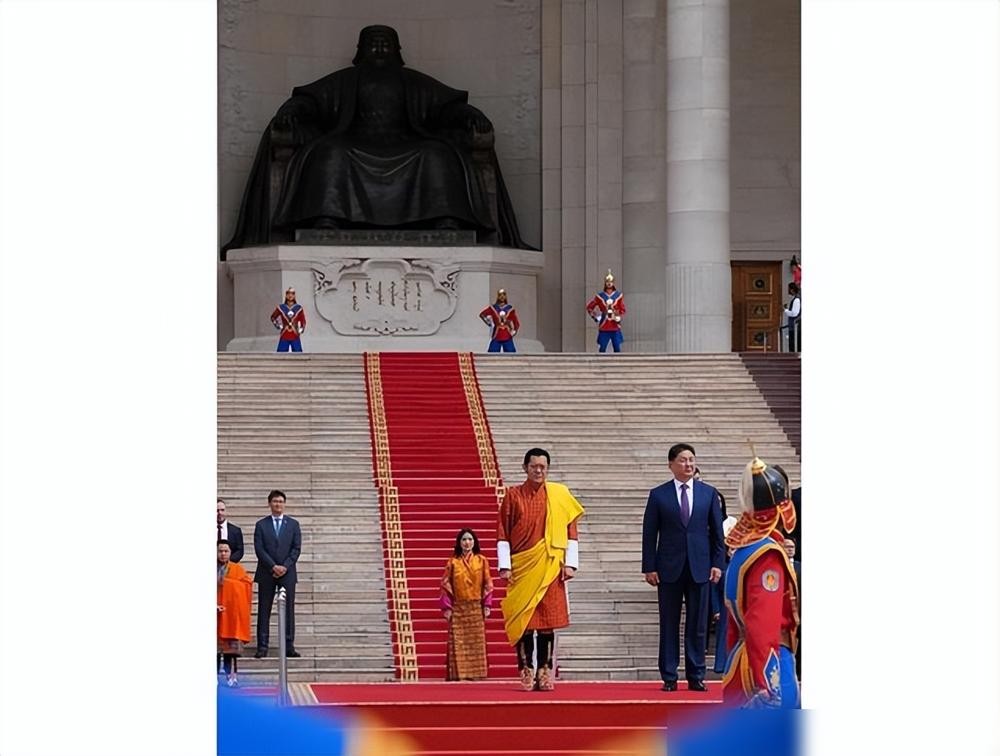 不仅有蒙古国总统和第一夫人参与欢迎仪式,这次的宾客也十分有面子,是不丹国王和王后。