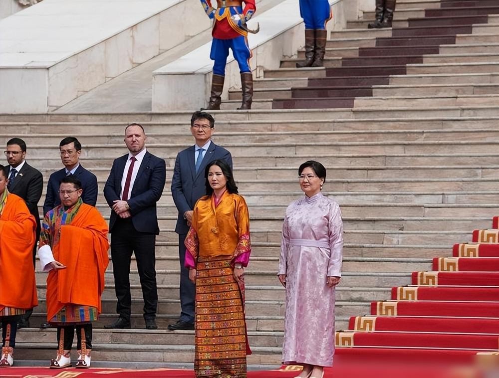 这是不丹国王王后首次访问蒙古国,蒙古国总统和夫人自然要以最隆重的仪式欢迎贵客,他们还特意打扮得体,更加隆重。