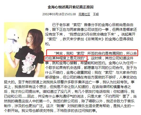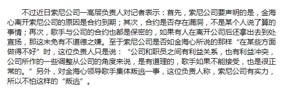 与此同时,恰好又有多名歌手与索尼解约,一时间,金海心成为带队集体逃离的“罪魁祸首”。