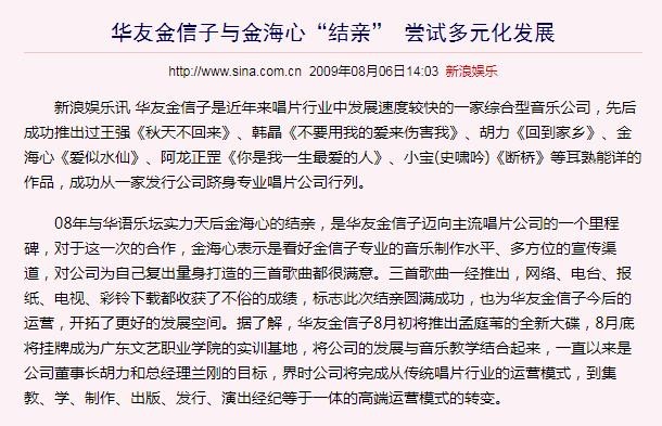 万般无奈之下,金海心离开华纳,又于2008年10月加入了华友金信子唱片公司。