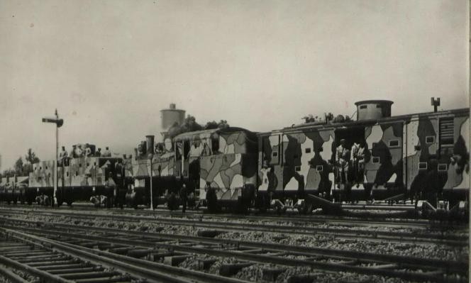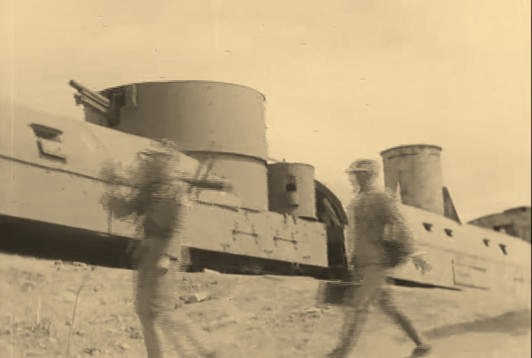 这张图片选自1938年四月台儿庄战役最为关键的时期,出现台儿庄后方战区的国军装甲列车,正向全速朝着台儿庄战役最前线行驶而去向前线部队运输物资和支援战斗,而附近就是中央军,军部直属150毫米45倍径榴弹炮阵地,当时正在向前线开火,该图片出自当时荷兰战地纪录片大师,尤里斯.伊文思的《四万万人民》纪录片之中。