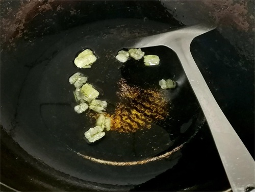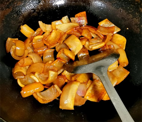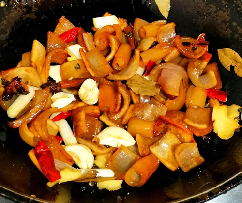3.锅里倒油,放入冰糖炒出糖色,再把猪皮炒一下,再下锅炖,这样炖出的猪皮色泽红润,Q弹,特别的香。