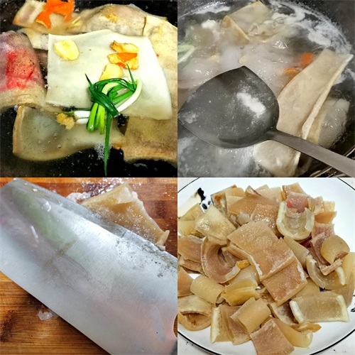 2.烧好的猪皮用温水反复的清洗干净,冷水下锅,倒入适量料酒,放入生姜片,桔子皮,小葱结。大火烧开,用锅铲撇掉上面的浮沫,转中火煮8分钟捞出,刮掉上面的油脂,再次用温水清洗干净,切小块备用。
