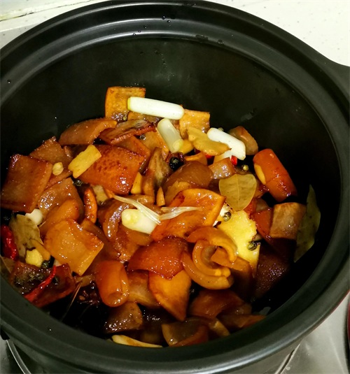 4.锅里到油,放入几块冰糖,小火不停的搅动炒出糖色,(冰糖溶化后由大泡变成小泡即可)将切好的猪皮倒入锅中,煸炒至均匀上色,放入生姜片,大蒜,大葱段,八角,桂皮,香叶,花椒,干海椒炒出香味,盛入砂锅中。