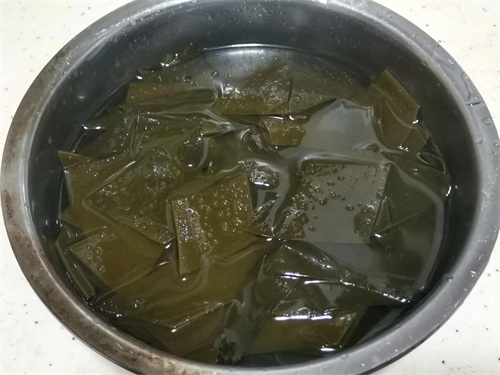 3.将黄豆提前一晚上用冷水泡发成圆鼓鼓的,(如果急用,可以直接用温水泡发,但是温度不宜过高),将干海带剪成小块倒入适量的温水,加入少许的白醋浸泡半小时,海带完全泡发后再加入少许的盐,轻轻的搓洗干净后切小块备用。