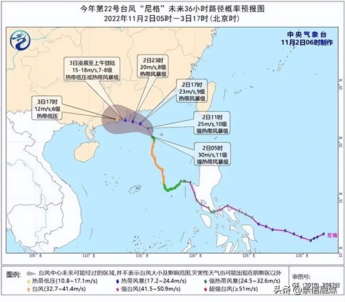 预计,“尼格”将以每小时15公里左右的速度向西北方向移动,强度逐渐减弱,并将于3日早晨到上午在广东珠海到阳江一带沿海登陆(热带低压或热带风暴级,7~8级,15~18米/秒),尚不排除3日白天在广东西部近海海面减弱消散的可能。