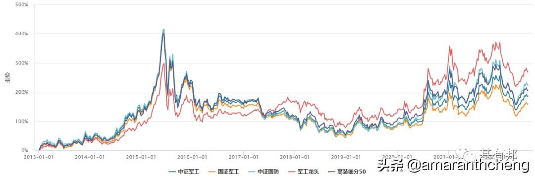 3、自12-12-31军工龙头和高装细分50基日起至22-07-19,军工龙头指数夏普比率0.57最高,中证国防、高装细分50、中证军工和国证军工分别为0.51、0.49、0.47和0.44。